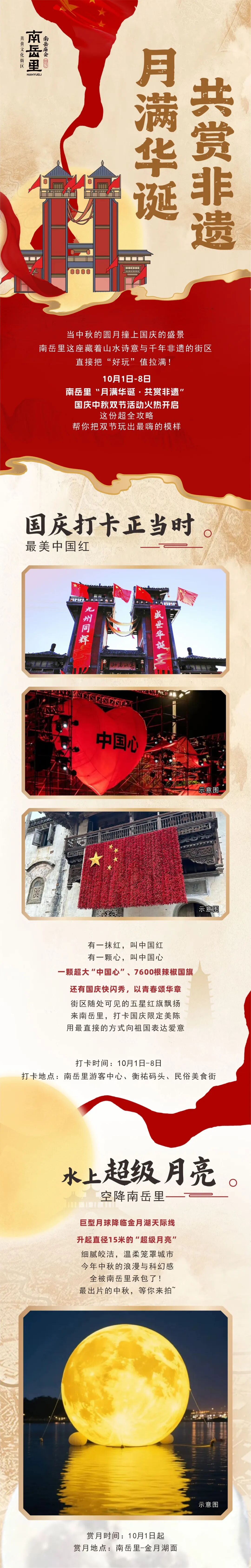 首页 简介 美食 活动 业态 地图 咨询 招聘 返回 >> 速收藏!超大中国心、巨型月亮、水上火壶…南岳里国庆中秋双节游玩攻略来啦~ 10月1日-8日南岳里“月满华诞·共赏非遗国庆中秋双节活动火热开启,一颗"中国心" 辣椒国旗 巨型月亮水上火壶 《天官赐福》非遗影子戏 共赴一场沉浸式非遗文化盛宴! 您的浏览器不支持 HTML5 video 标签。